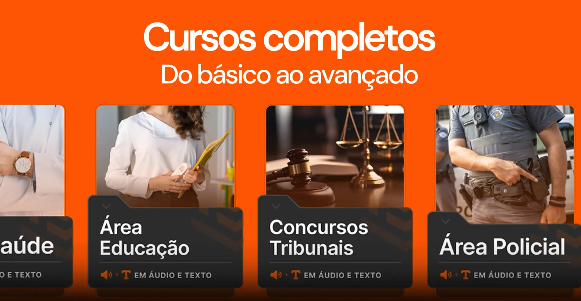 Você aprende ouvindo aulas feitas desde o início para áudio, com didática específica e voz humana, não adaptações de vídeo ou leitura robotizada.