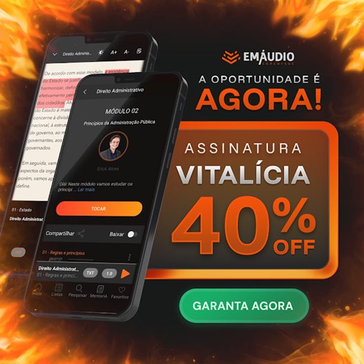 Tanto para iniciantes quanto para estudantes avançados, a assinatura vitalícia do EmÁudio Concursos é extremamente vantajosa. Se você está começando agora, vai aproveitar todo o conteúdo para construir uma base sólida; se já está treinando há meses, vai usar os áudios de revisão para consolidar seus conhecimentos e garantir a memorização de longo prazo.